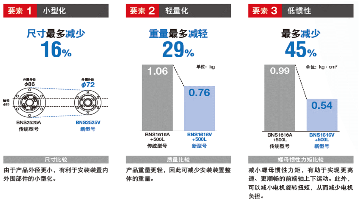 在相同的轴径下缩小了螺母外径,减轻了重量,从而缩短了节拍时间。