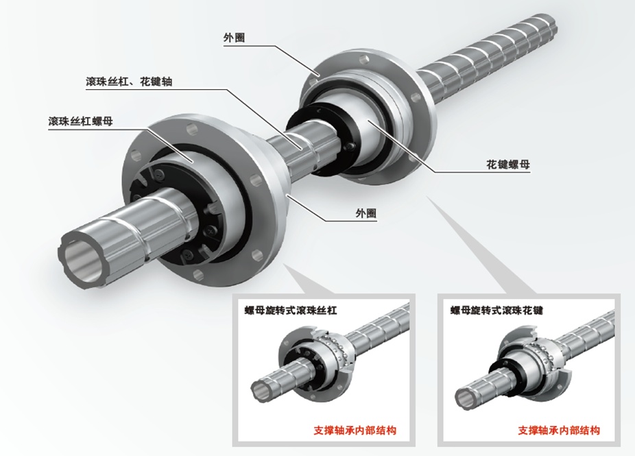 将专用的支撑轴承直接装入滚珠丝杠螺母及花键螺母外圆的复合型产品。