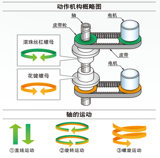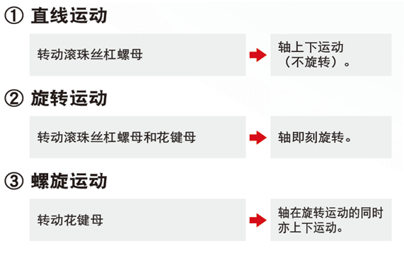 通过使滚珠丝杠螺母、花键螺母旋转或停止,仅用单轴即可进行旋转、直线及螺旋运动。