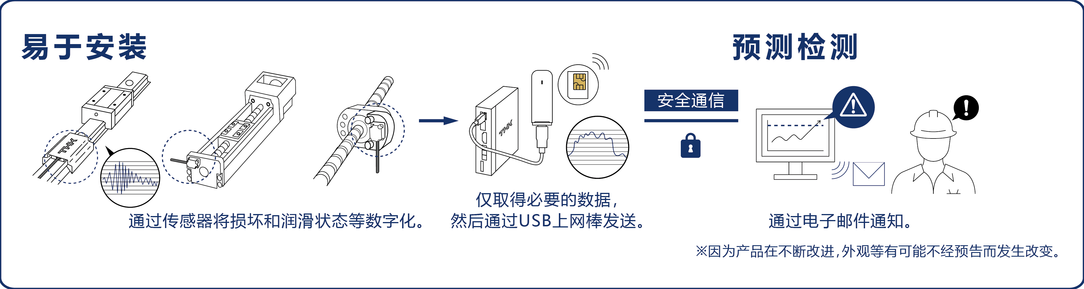 “OMNIedge”将传感器安装在机械要素部件上,利用“THK SENSING SYSTEM”,通过安全的通信网络,运用独特的算法收集数据进行数字化分析,进行状态诊断和“预测性维护”。提供包括传感器和驱动器等硬件,以及通信设备到应用程序一体化的服务。