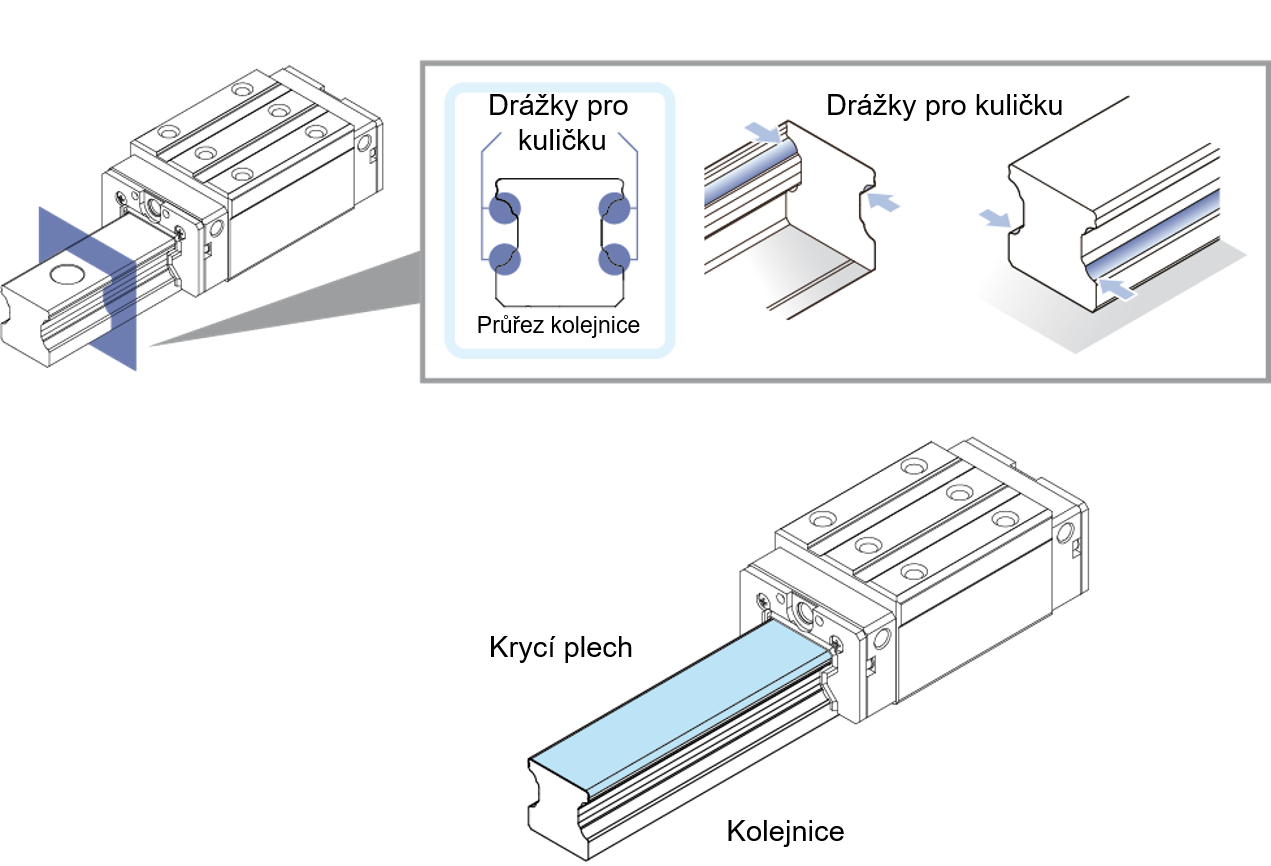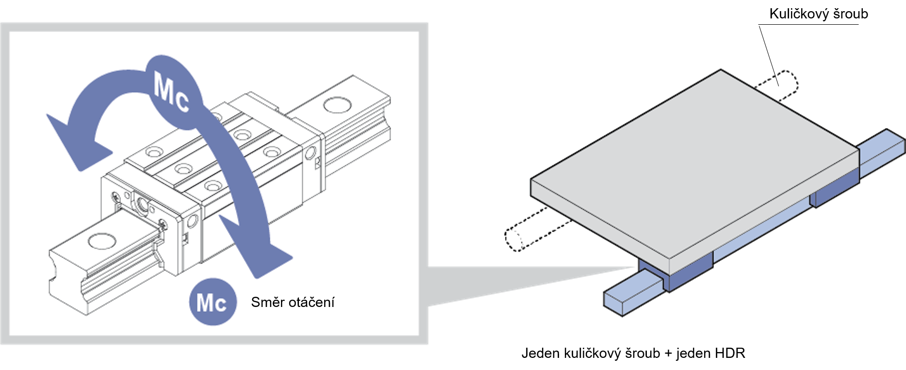 Používá jako valivý člen kuličky s vysokou tuhostí ve směru Mc, což umožňuje použít pouze jednu kolejnici, i když je zatížení pouze v jednom směru a pouze na okamžik.