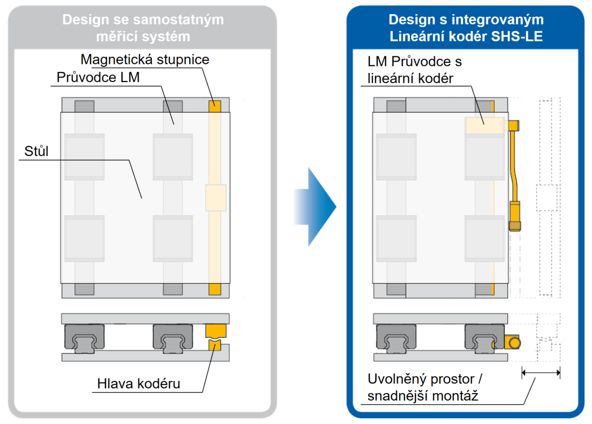 Kombinuje globální standardní model SHS a lineární odměřování (kodér) THK.