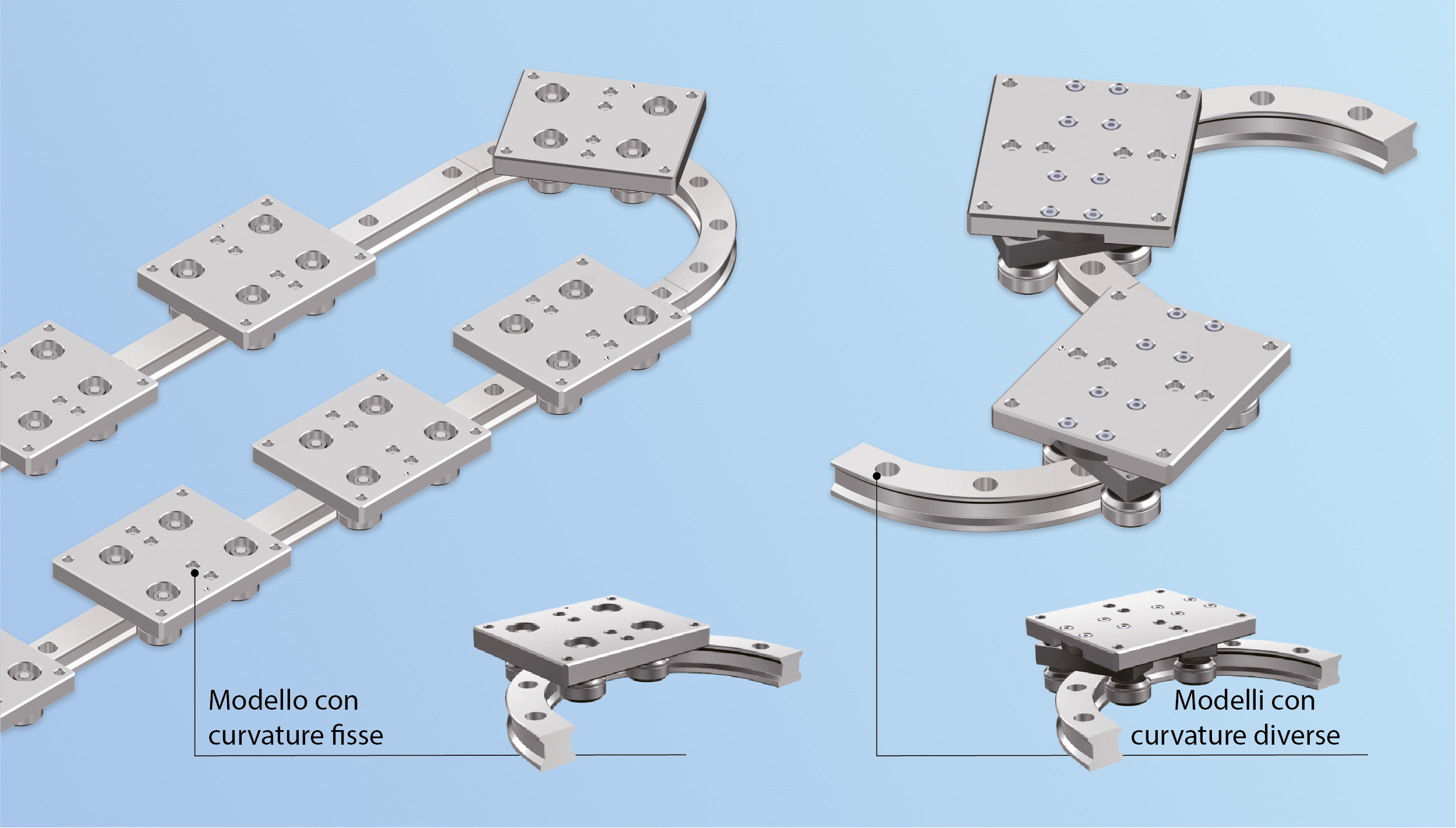 CurviLinear Wheel Guide viene proposto in due versioni: la prima, con una rotaia a raggio fisso [curvatura standard]; la seconda versione con curvature diverse che si adatta a vari layout di tracciato. I carelli corrispondenti sono ottimizzati per questi due varianti.