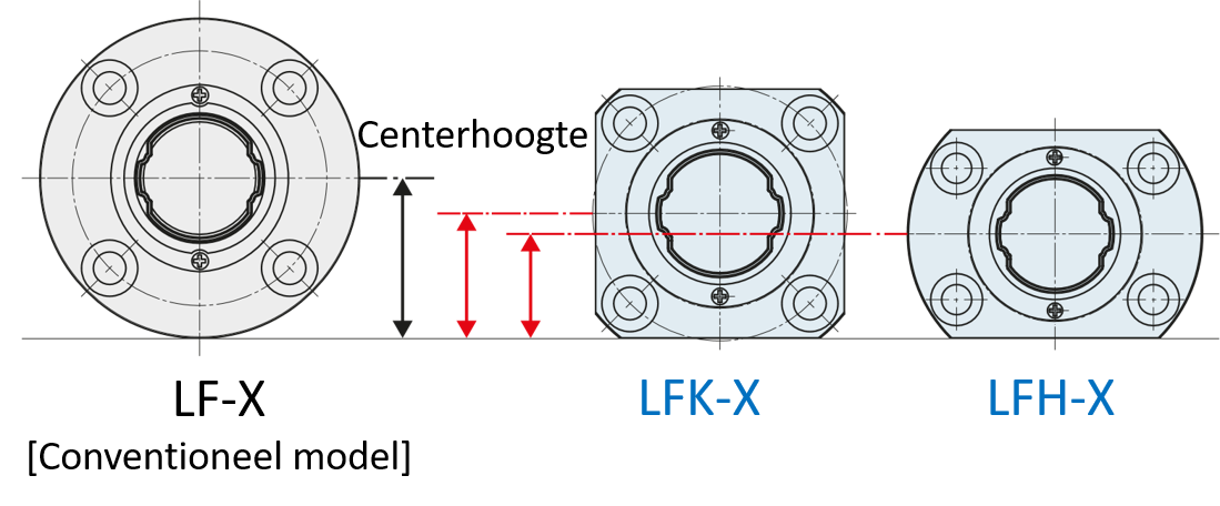 De modellen LFK-X en LFH-X zijn ontworpen met een lager centerhoogte dan het conventionele model LF-X. Dit maakt compacter ontwerpen en ruimtebesparende aansluiting van randapparatuur mogelijk.